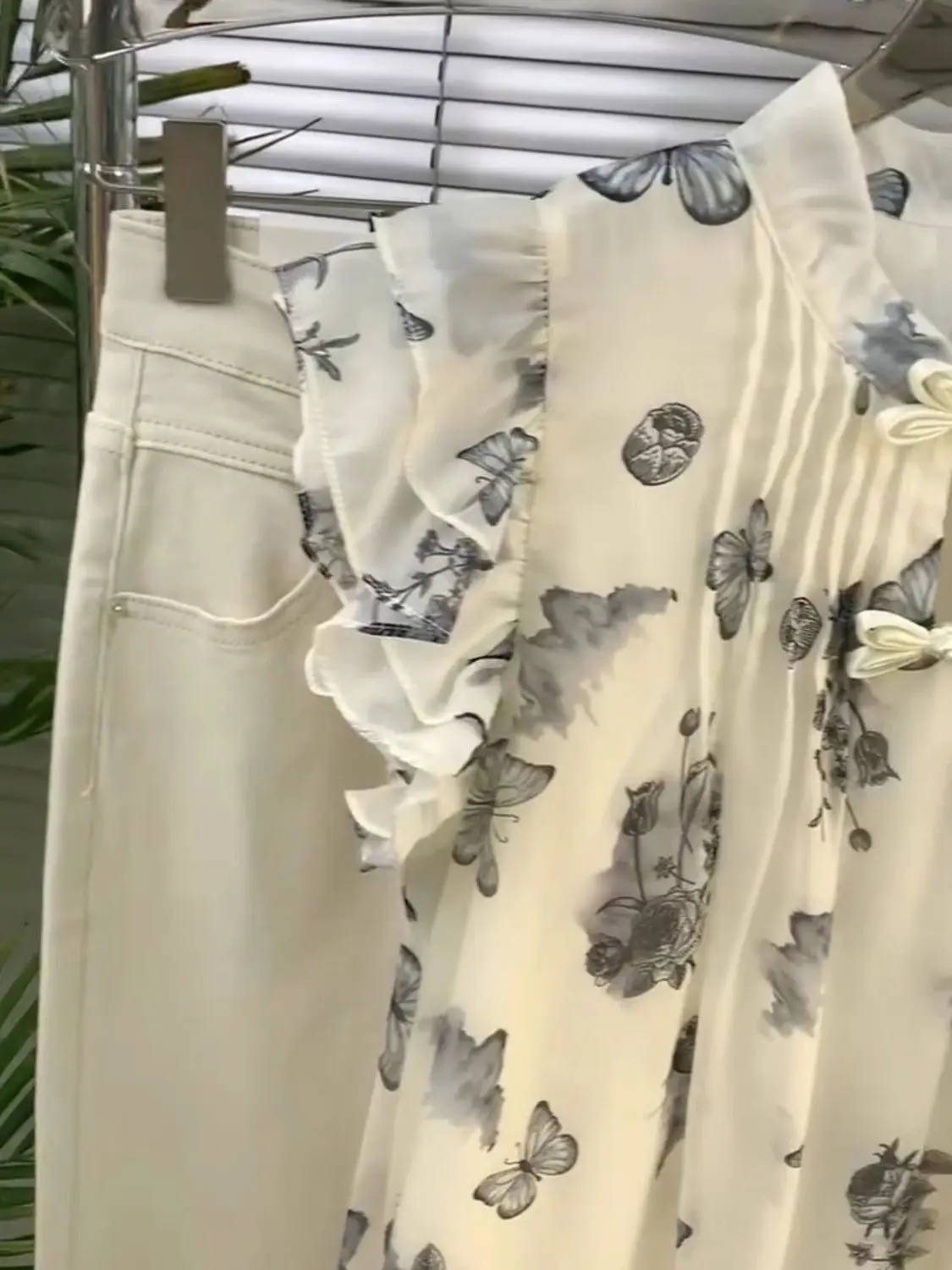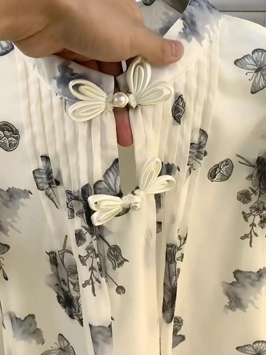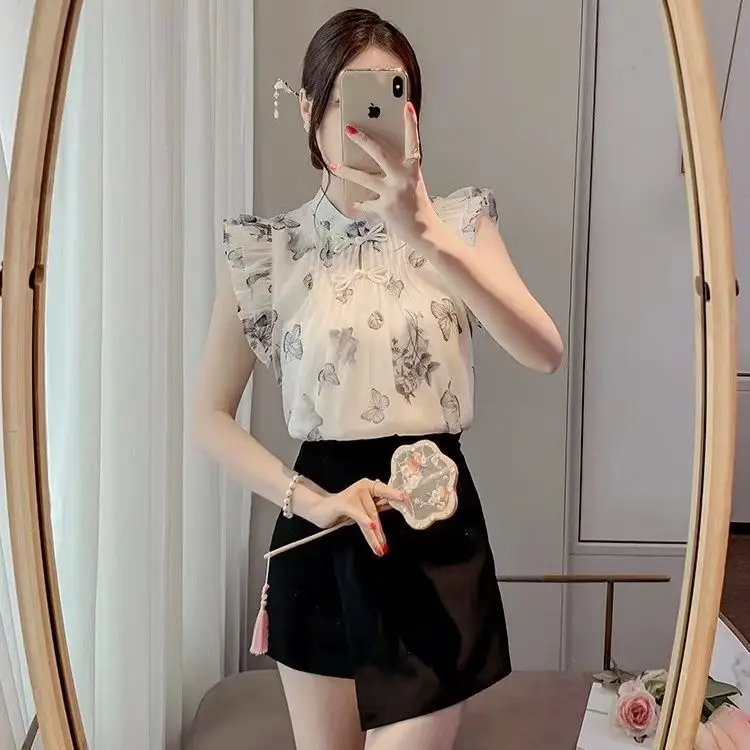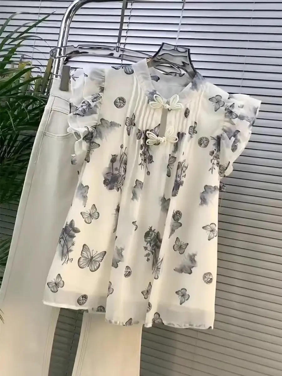 Chinese Style Top for Women Retro Style Small Flying Sleeve Chiffon Floral Shirt Summer Top