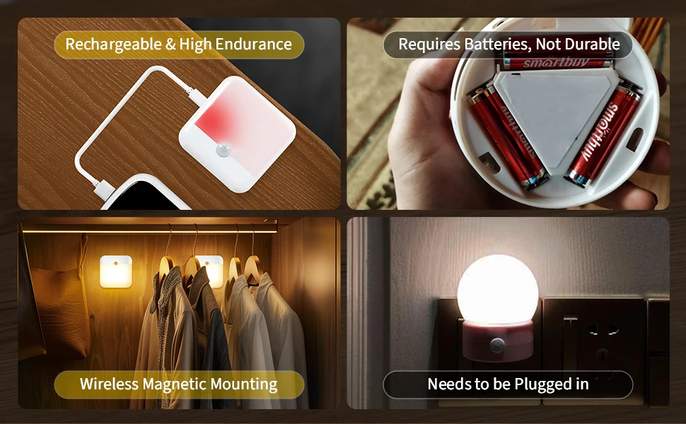 PIR Motion Sensor Night Light,Rechargeable LED Wall Lamp,Indoor Corridor Bedroom Stairs Closet,Warm White Lighting,Night Light